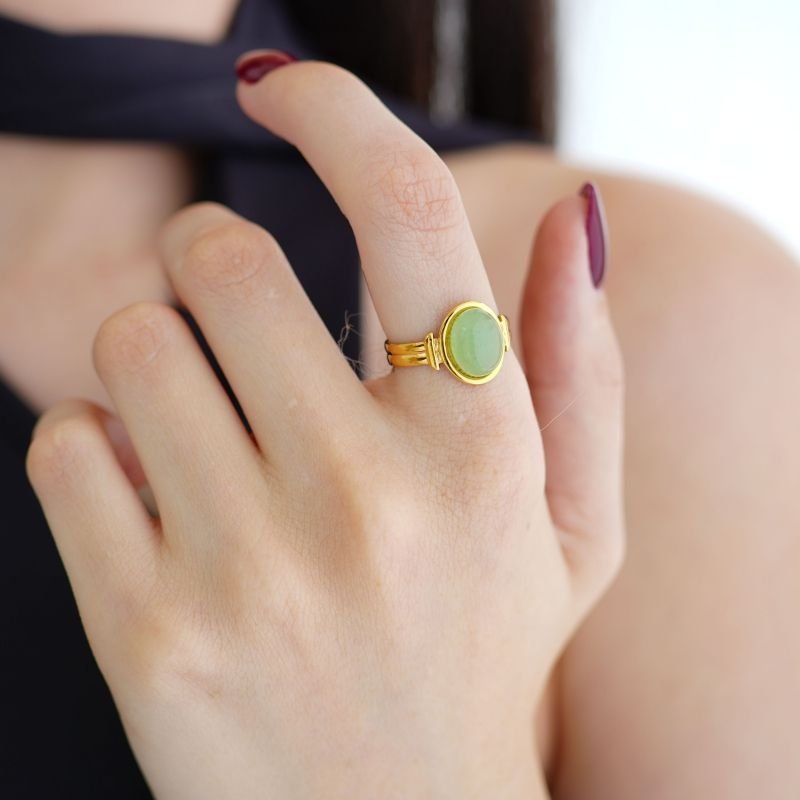 O Anel Delicate Light Green une a suavidade da pedra verde clara ao brilho do aço inox em um design atemporal. Sua estrutura levemente regulável garante conforto e o ajuste ideal para qualquer ocasião.