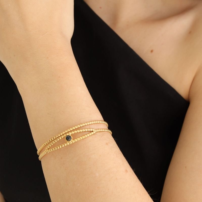 Vista pela lateral do pulso e ajuste delicadamente até o caimento desejado. Use sozinho para destacar o símbolo de proteção ou combine com pulseiras finas para um mix moderno e equilibrado. Transita bem do casual ao elegante.