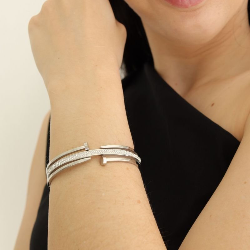 O Bracelete Prego Duplo Cravejado em Aço Inox (Linha Premium) combina presença contemporânea e brilho sutil. As duas voltas no estilo prego, com cravação delicada, criam um efeito marcante e elegante no pulso — perfeito para elevar o visual do dia a dia e de ocasiões especiais.