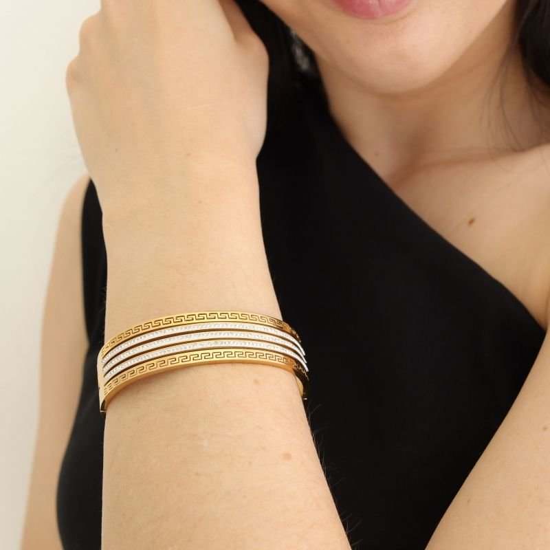O Bracelete Triplo Moderno em Aço Inox (Linha Premium) tem visual marcante e contemporâneo. O efeito em três linhas cria presença elegante no pulso, entregando sofisticação com leveza para compor do casual ao refinado.