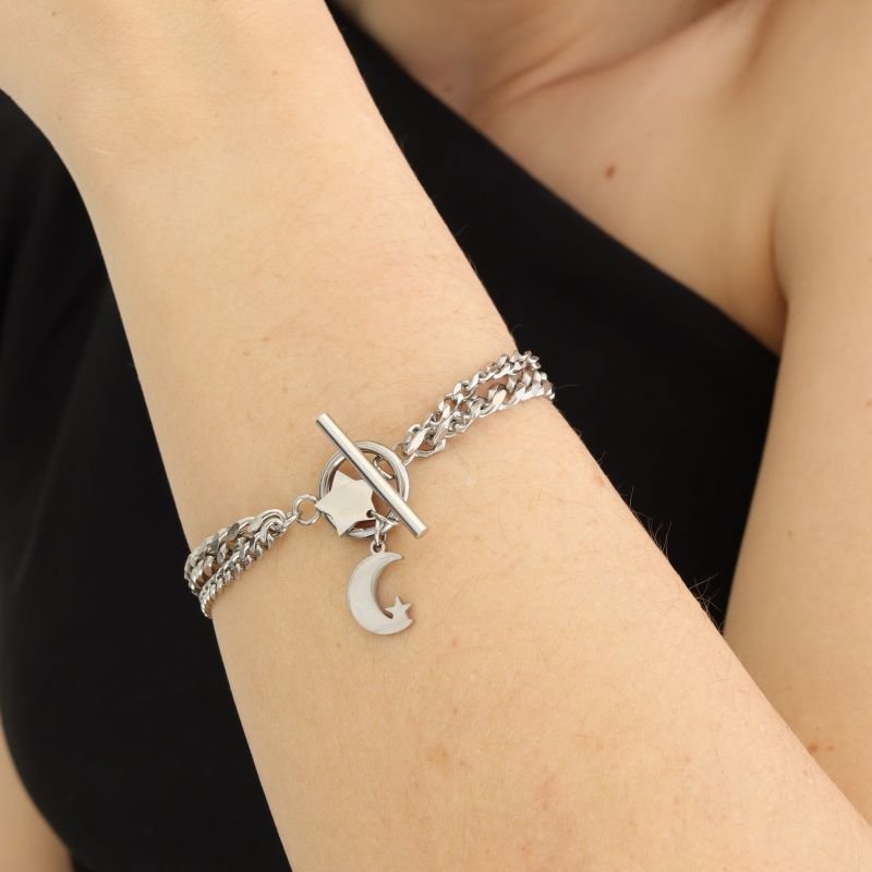 A Pulseira com Pingentes (Fecho Bóia) em Aço Inox – Estrela e Lua é delicada e simbólica. Os pingentes trazem movimento e um toque de luminosidade ao pulso, compondo um visual moderno e elegante para o dia a dia.