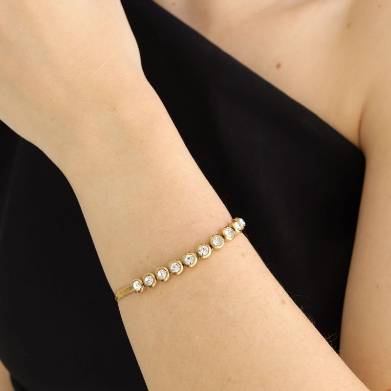 A Pulseira Laminada com Strass em Aço Inox (Linha Premium) une leveza e sofisticação. A malha laminada garante caimento elegante, enquanto o strass distribui brilho sutil ao longo da peça — ideal para iluminar o pulso no dia a dia ou em ocasiões especiais.